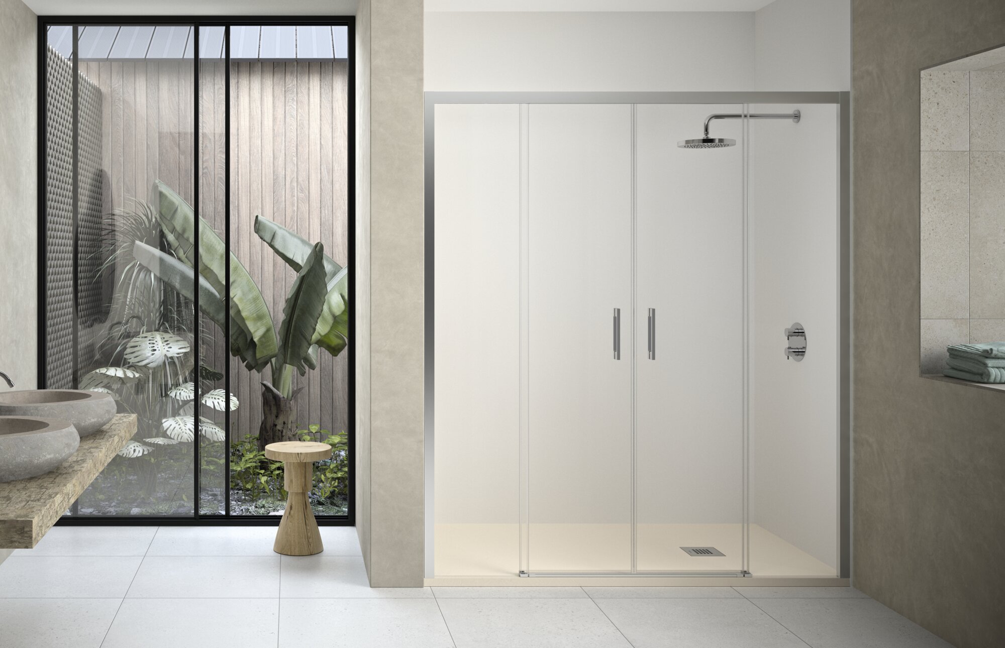 Mampara doble acceso con 2 fijos + 2 correderas. Cristal 6mm. Ancho hasta 200cm. Altura 195cm.