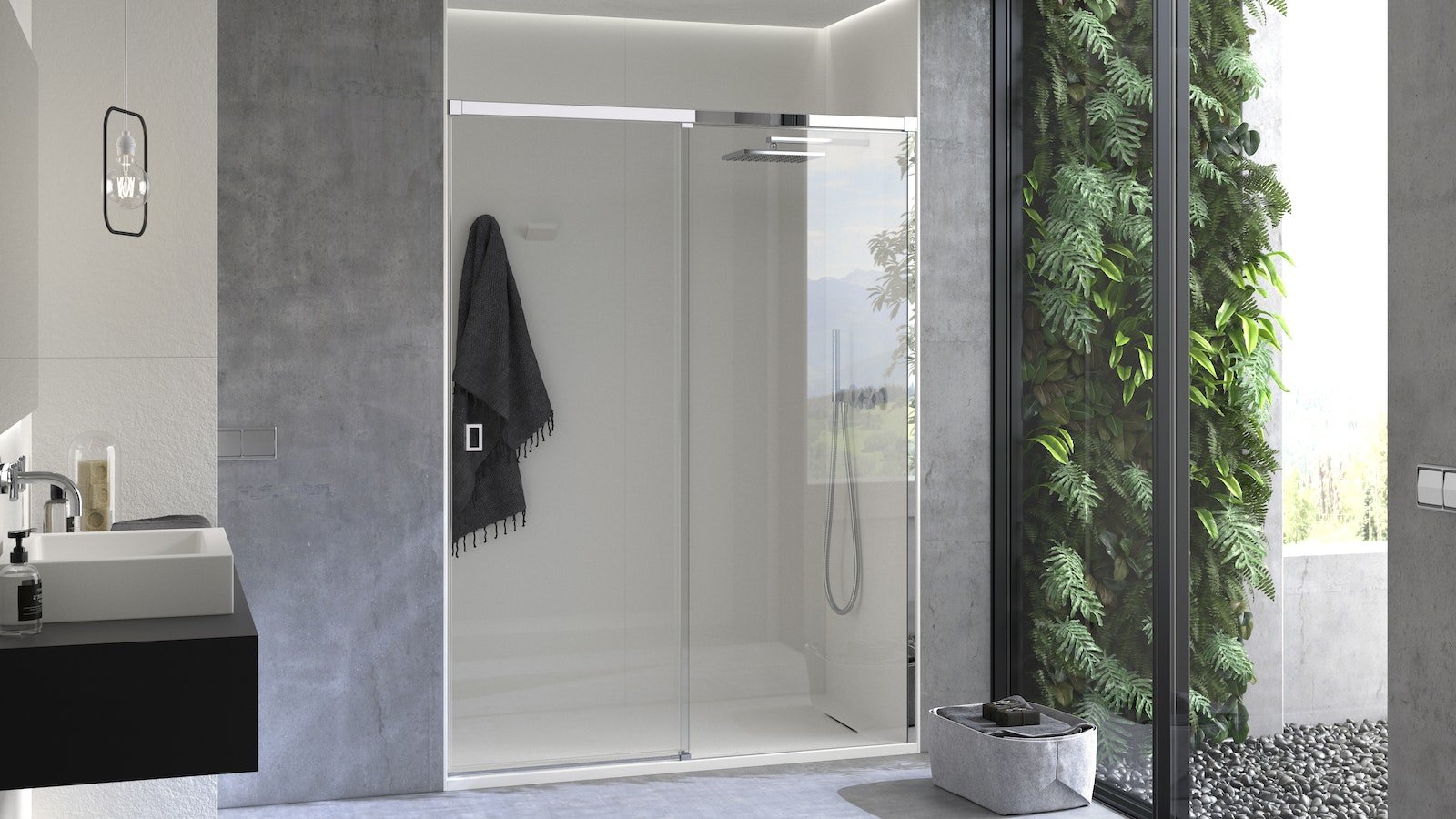 La mampara **Vilna** es una elegante corredera de 2 hojas perfecta para platos de ducha. Acabado disponible en acero inoxidable alto brillo.